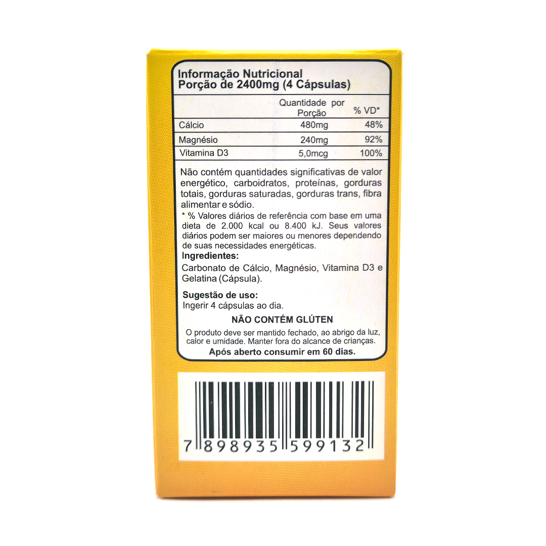 Carbonato de Cálcio, Magnésio, Vitamina D3 e Gelatina (Cápsula).